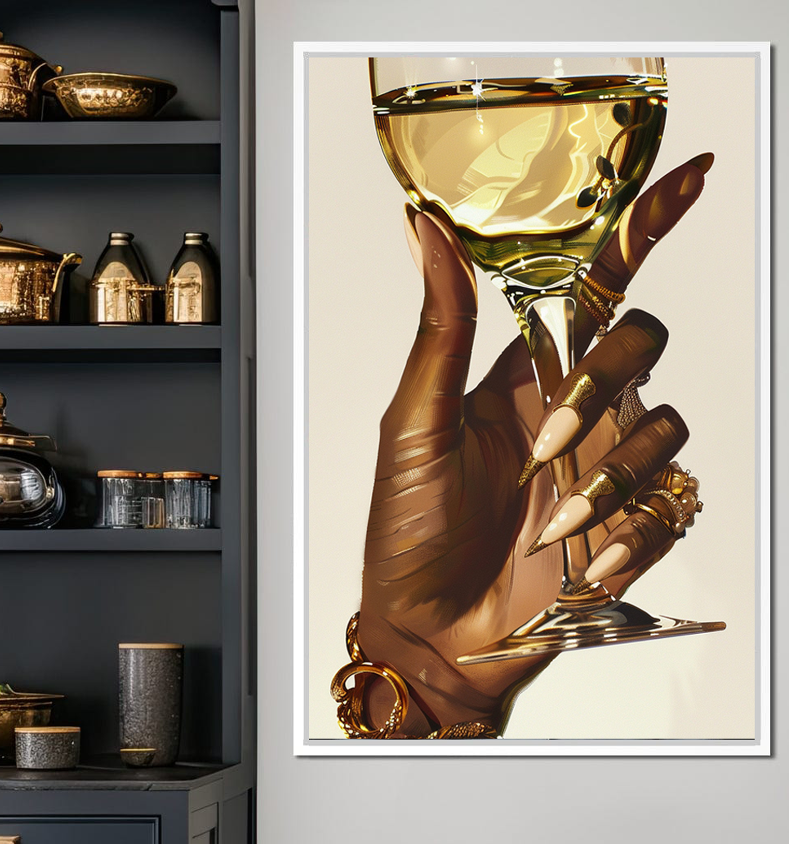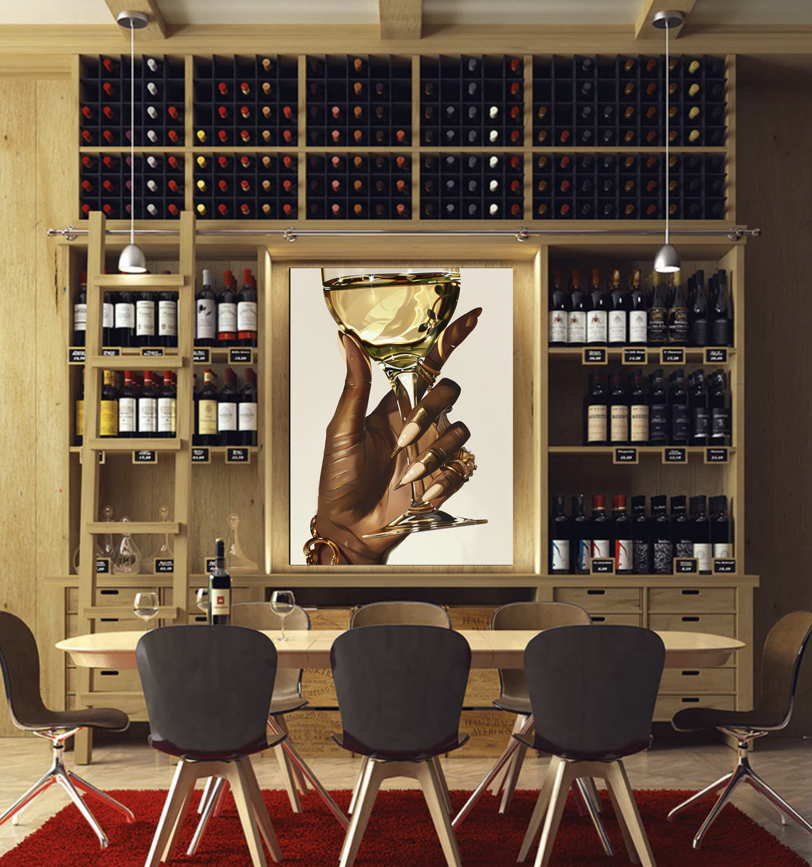 Featuring a beautifully adorned hand holding a glass of golden wine, this piece reflects sophistication, empowerment, and the pleasure of life’s refined moments. The polished jewelry, long sculpted nails, and warm tones evoke glamour, wealth, and unapologetic self-expression.