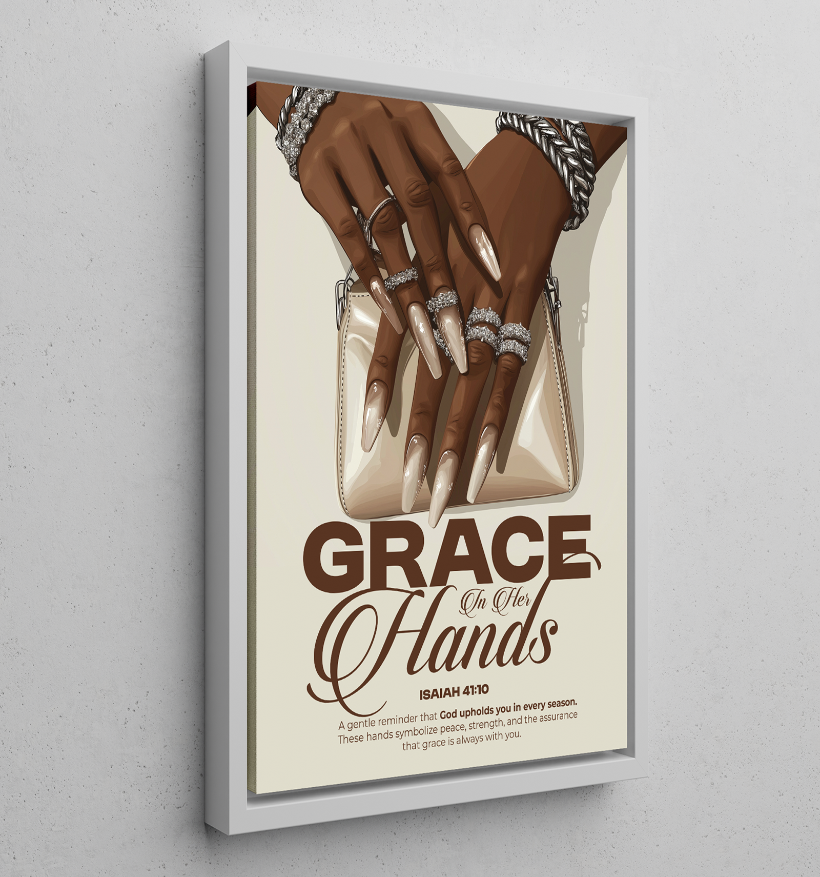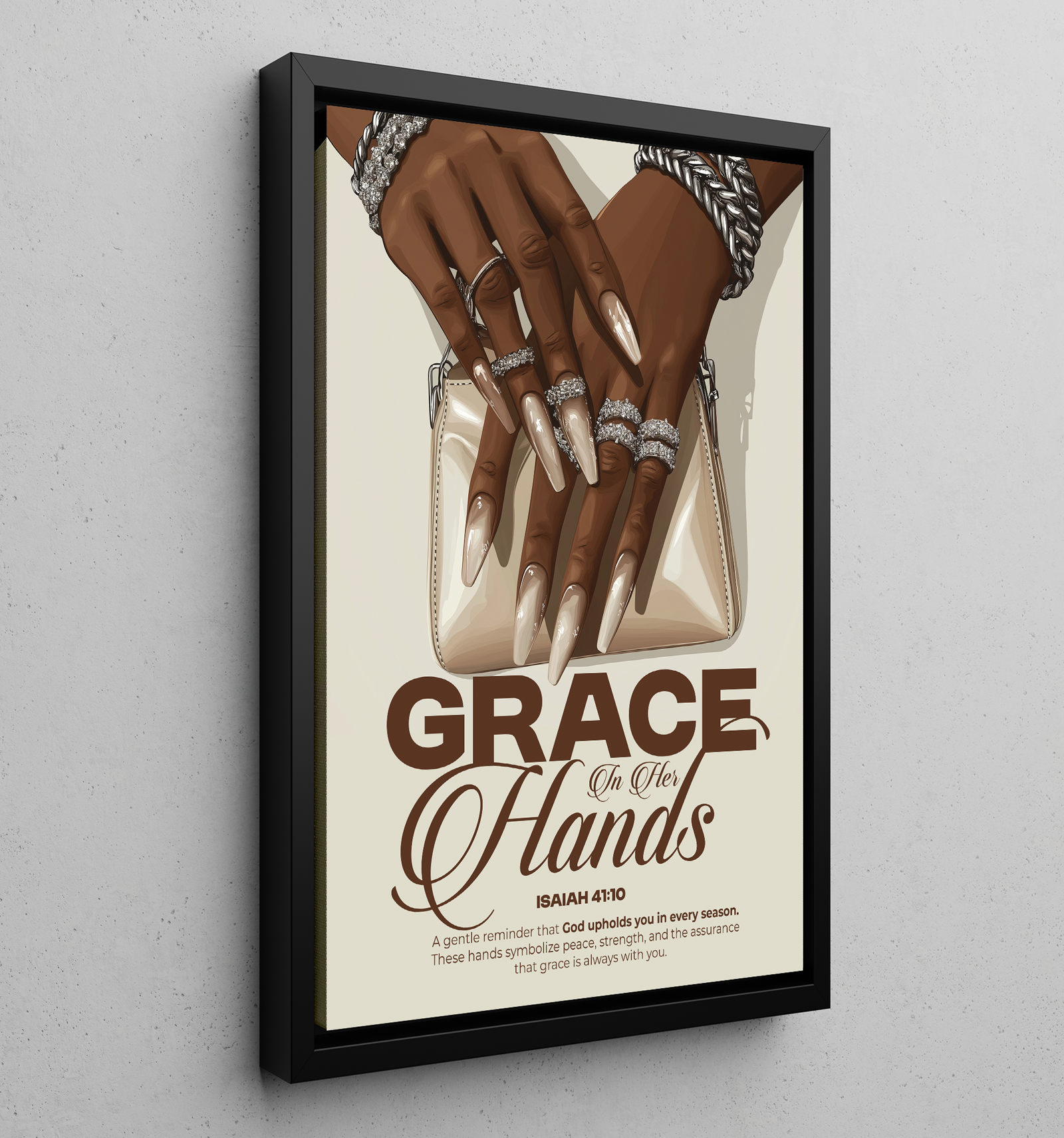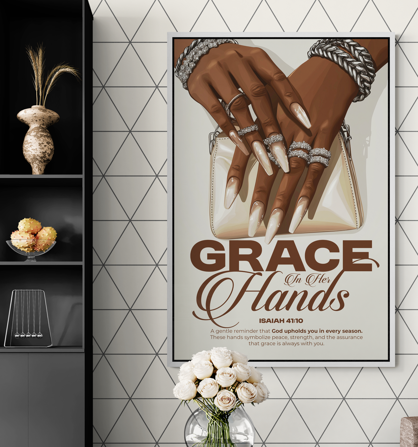 Elegant, powerful, and spiritually uplifting — Grace In Her Hands celebrates strength wrapped in beauty. Featuring a pair of poised, jewel-adorned hands resting gently over a soft-toned purse, this artwork symbolizes dignity, favor, and the quiet confidence that comes from knowing God is always near. It is a visual reminder of Isaiah 41:10 — that His grace upholds, strengthens, and surrounds you in every season.