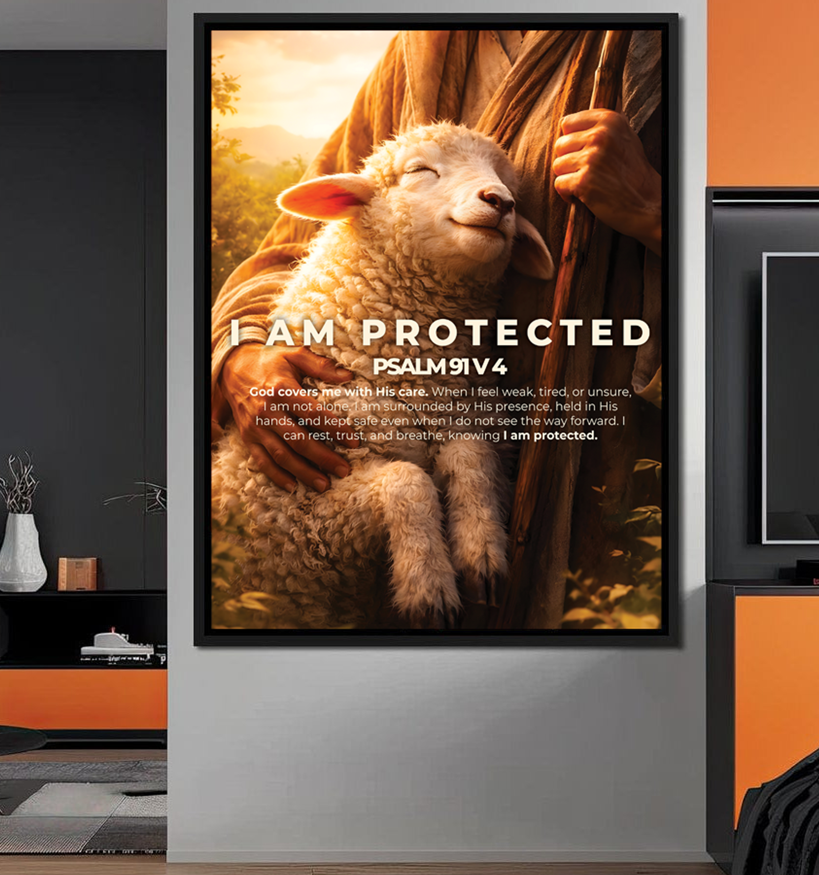 Bring reassurance into your space with I AM PROTECTED, a faith inspired canvas designed to remind you of God’s constant presence and care. The gentle image of the lamb resting in the shepherd’s arms reflects safety, trust, and divine covering. This artwork transforms any room into a place of calm, prayer, and quiet confidence.