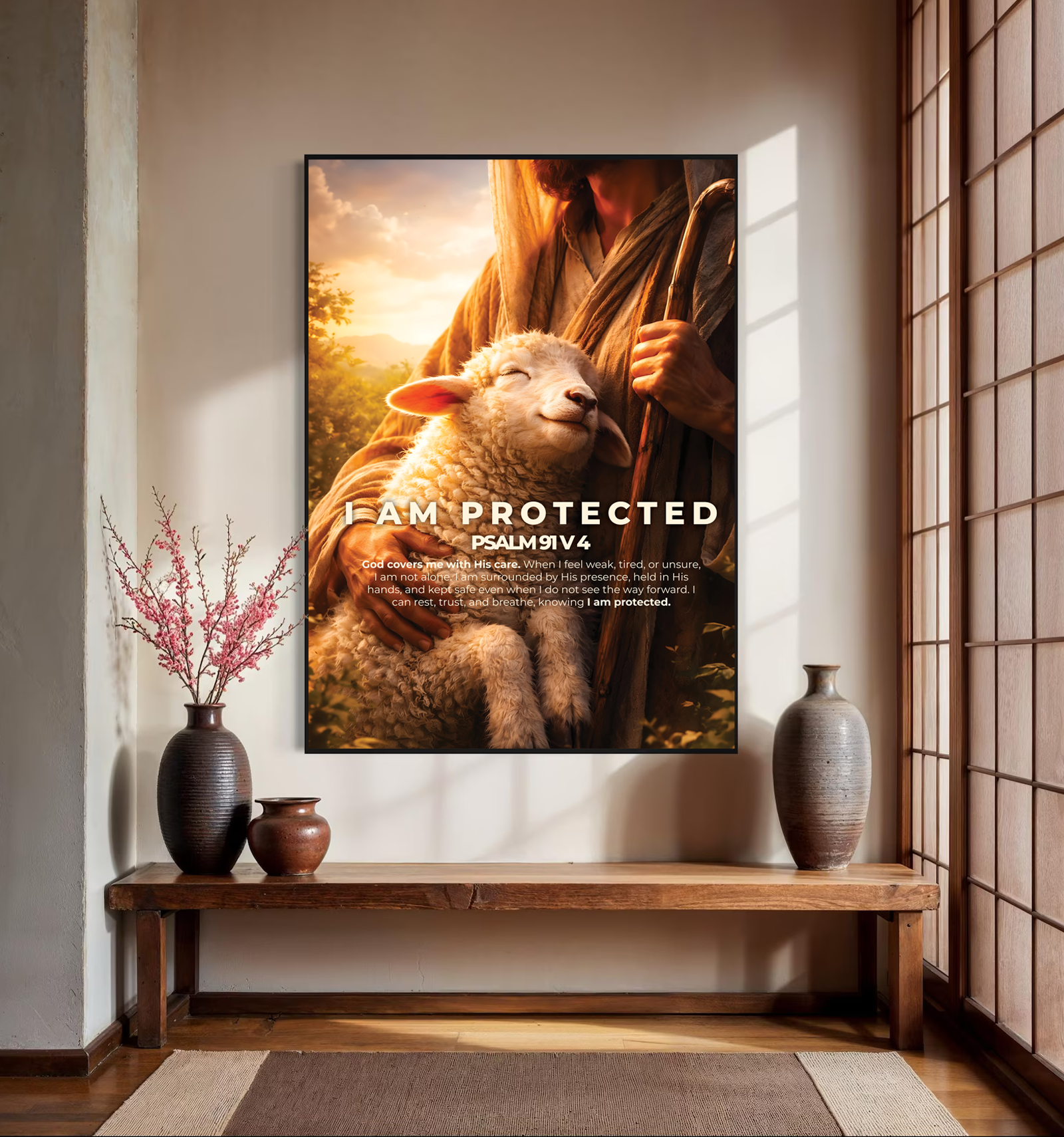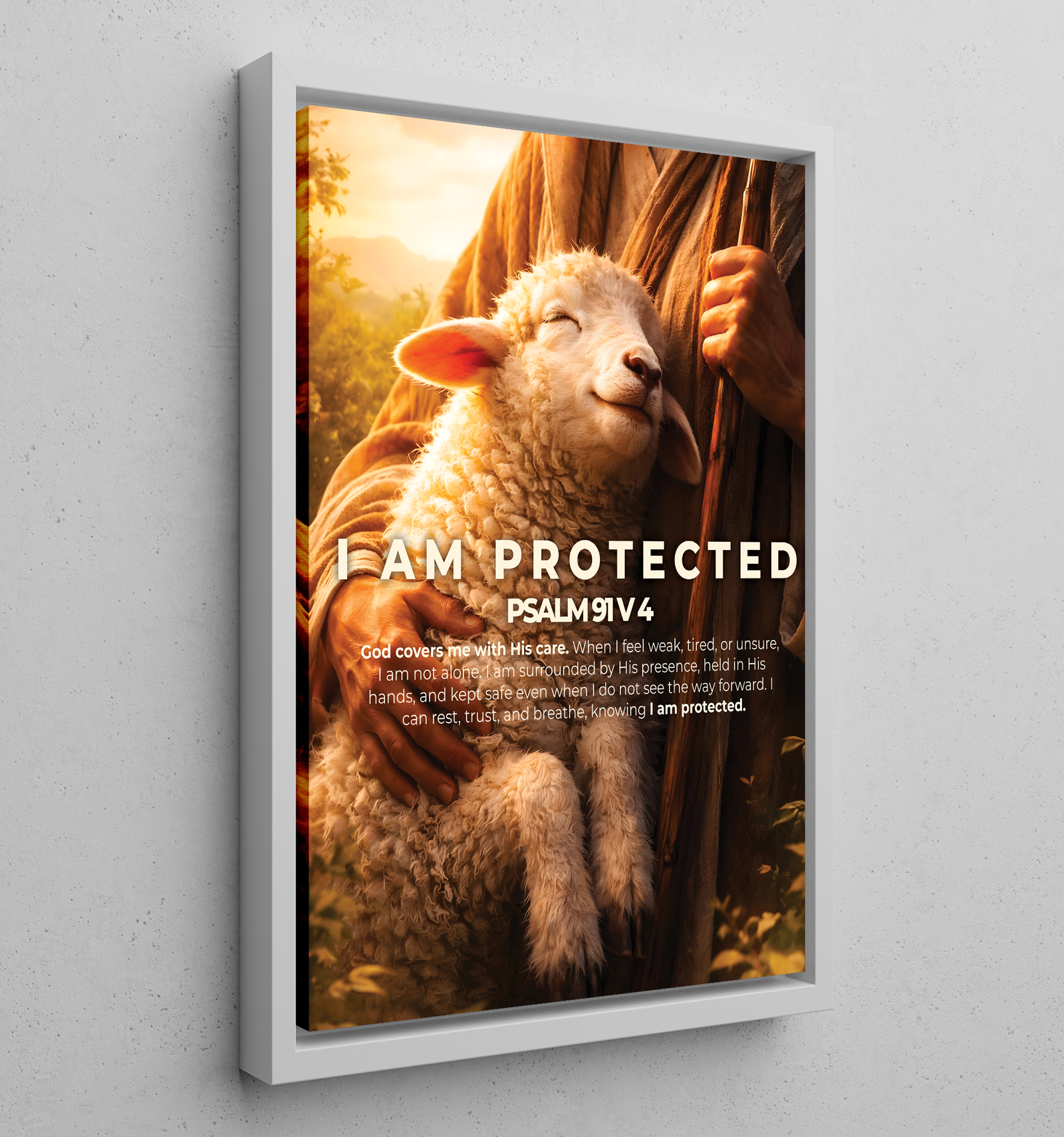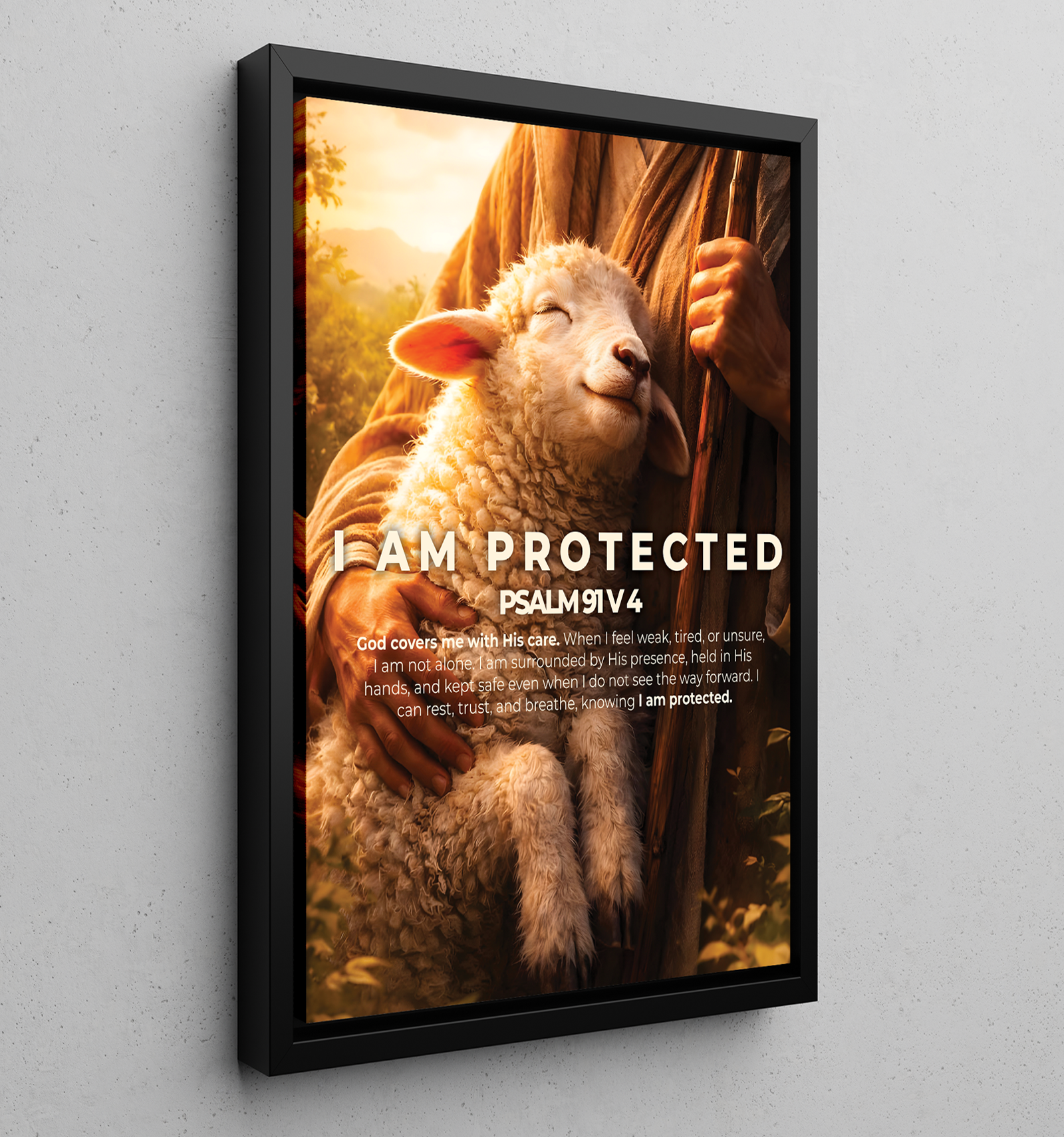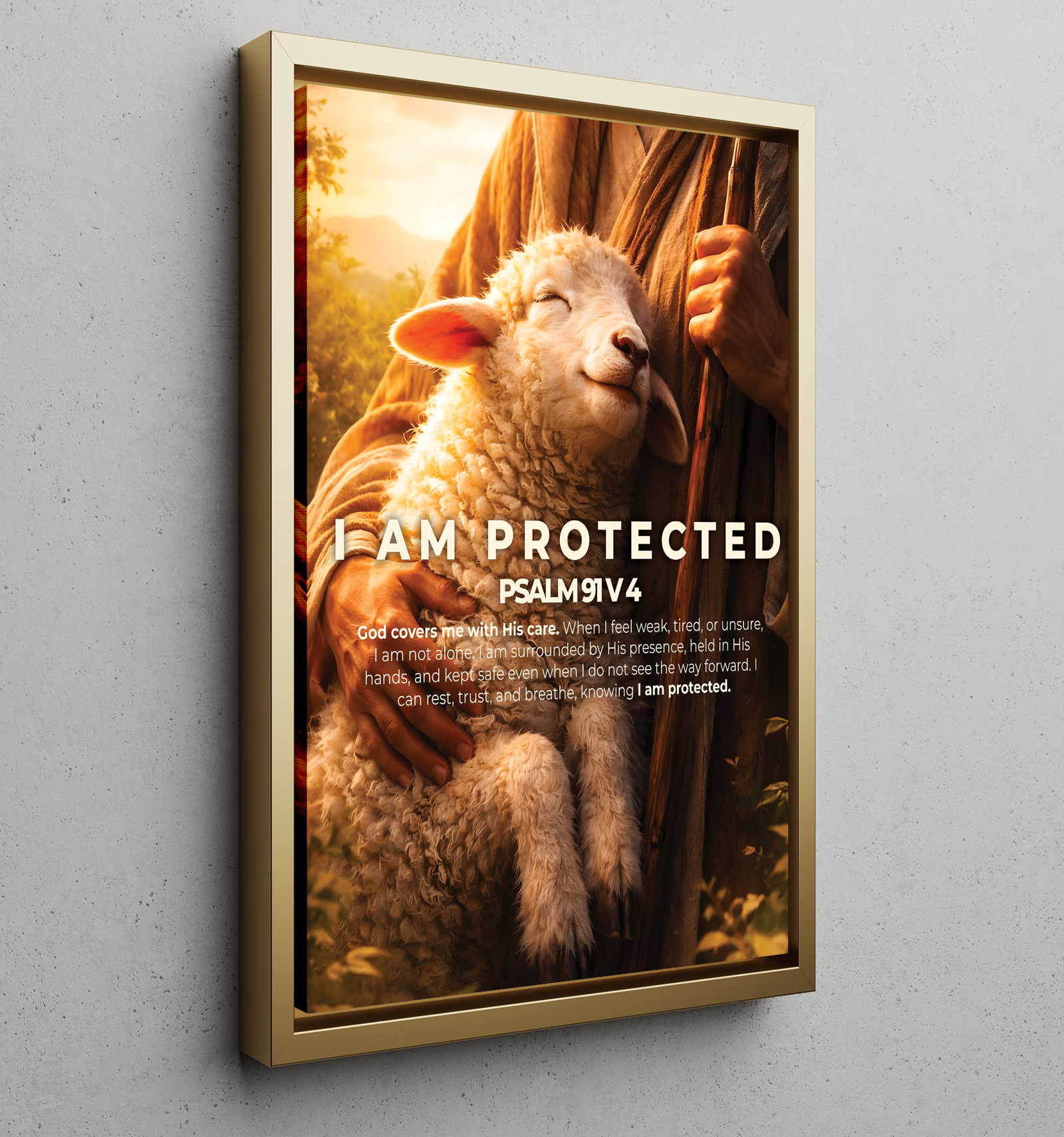 “I am protected” is a declaration rooted in trust, not fear. Inspired by Psalm 91:4, this artwork reflects the promise of God’s covering even in moments of uncertainty. Just as the lamb rests peacefully in the shepherd’s embrace, this image reminds us that we are never alone, never forgotten, and never unguarded.