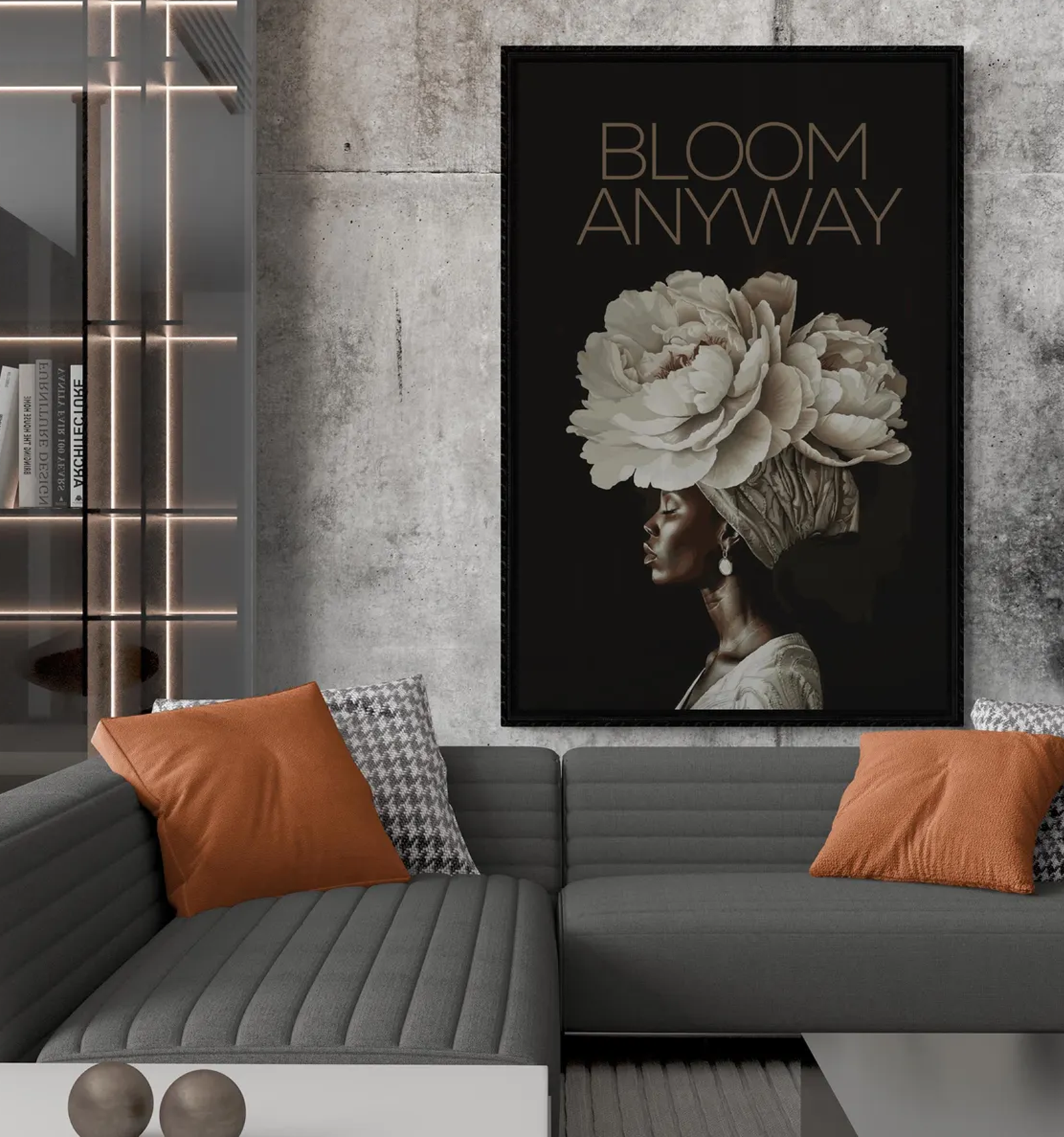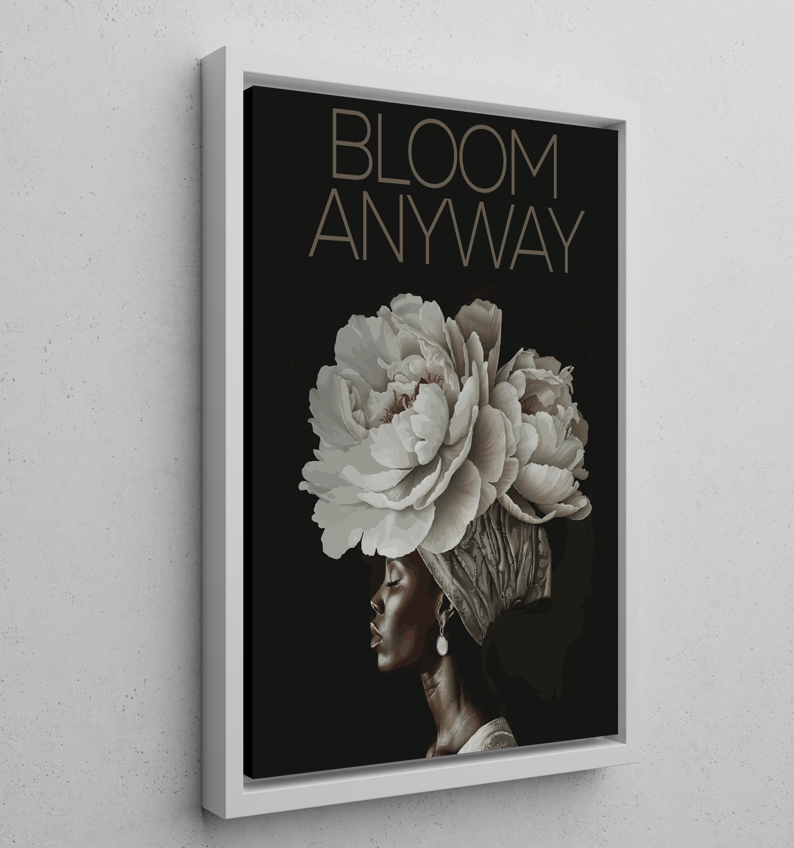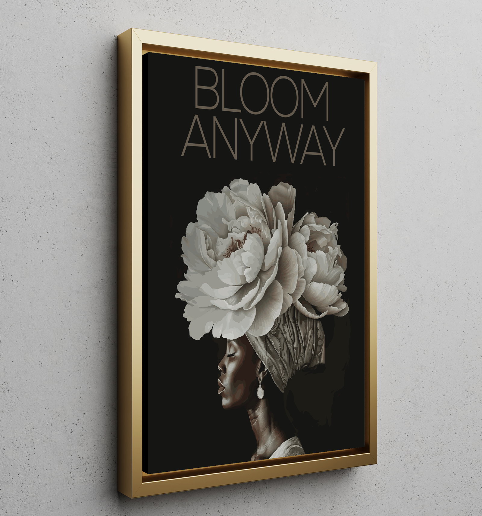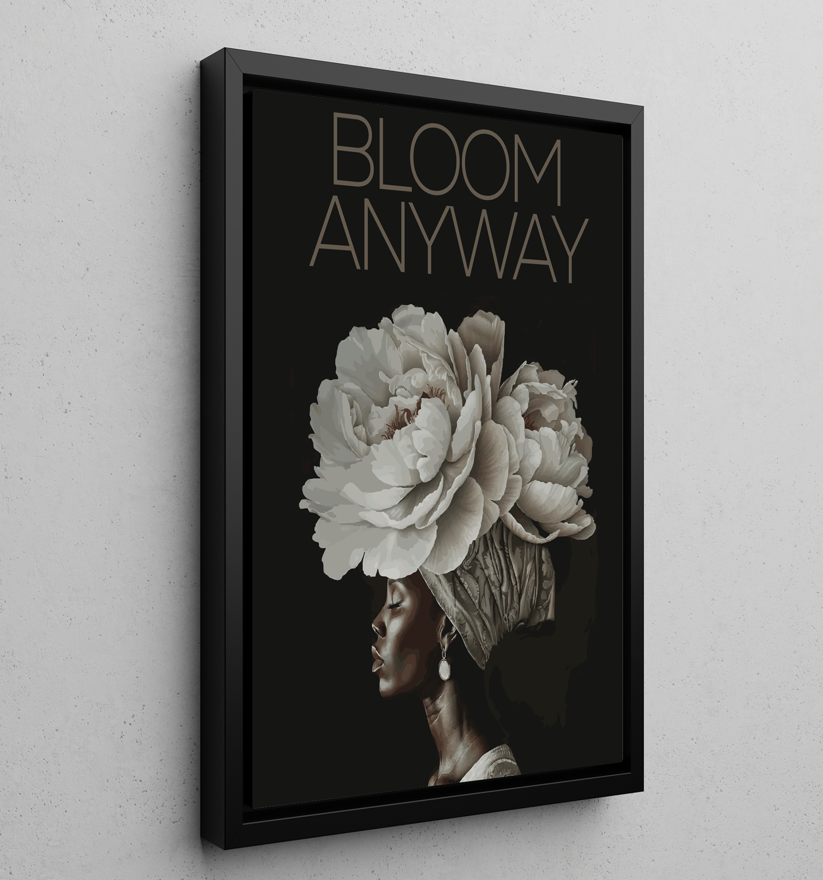 Bring strength and quiet confidence into your space with BLOOM ANYWAY, an empowering canvas designed to affirm resilience, self worth, and the courage to grow despite circumstances. The striking profile of a Black woman crowned with blooming flowers symbolizes beauty that rises even in darkness. Set against a deep black background, the artwork reflects grace, endurance, and inner power.