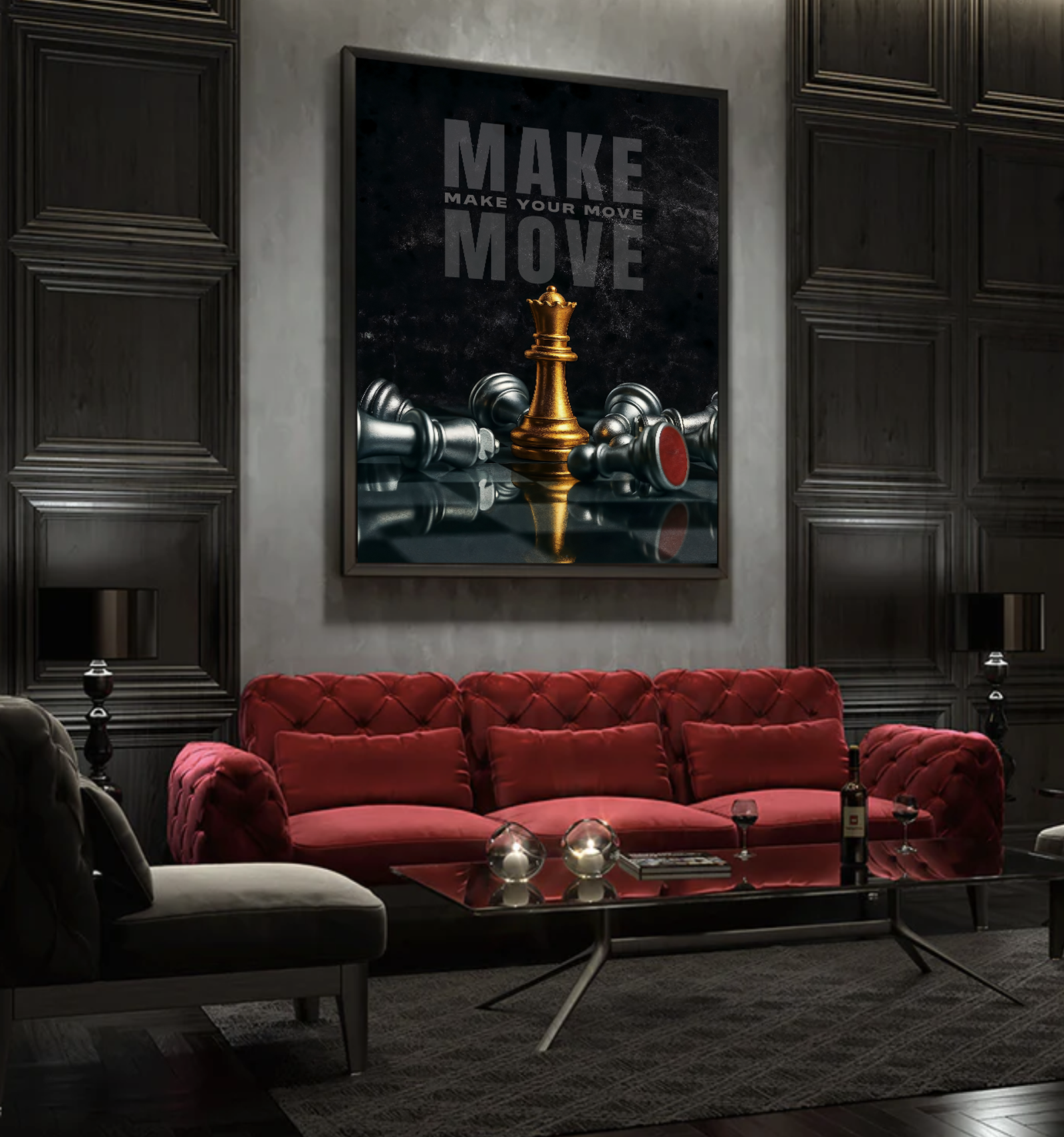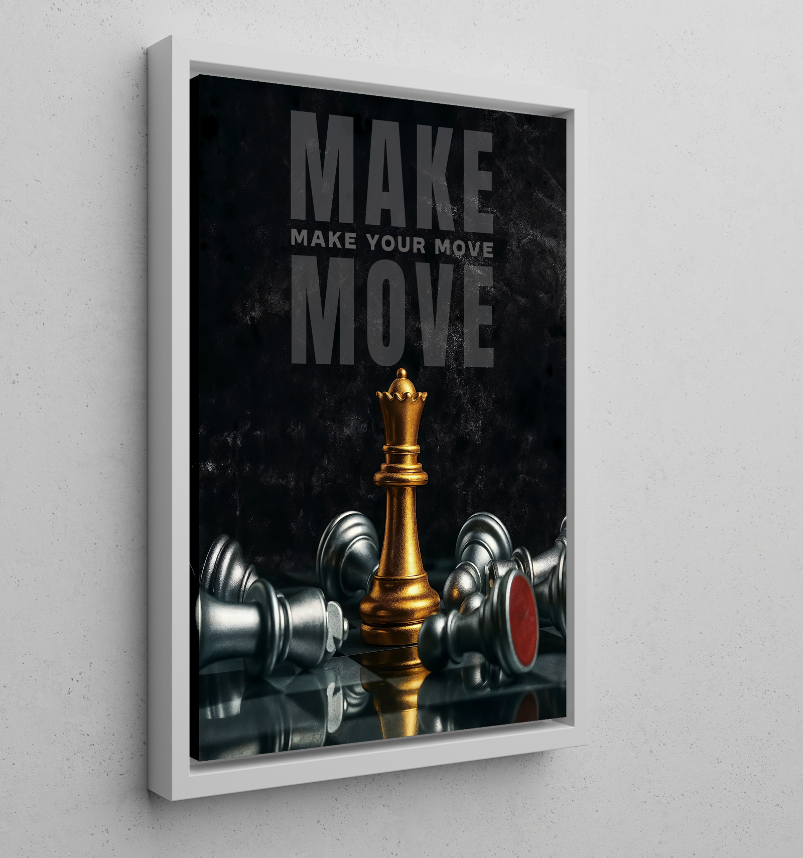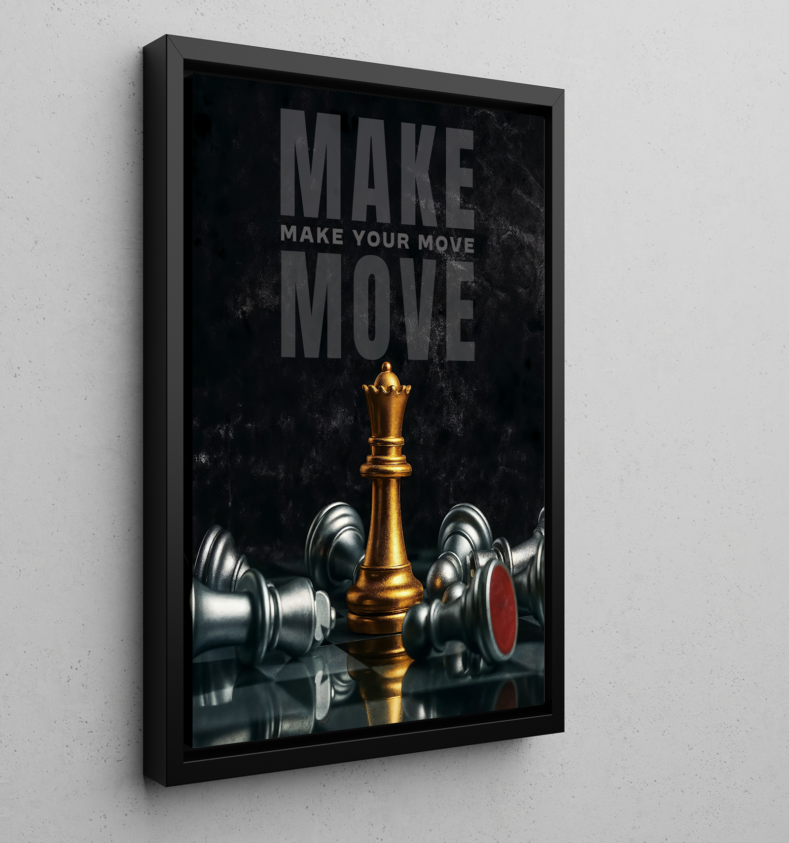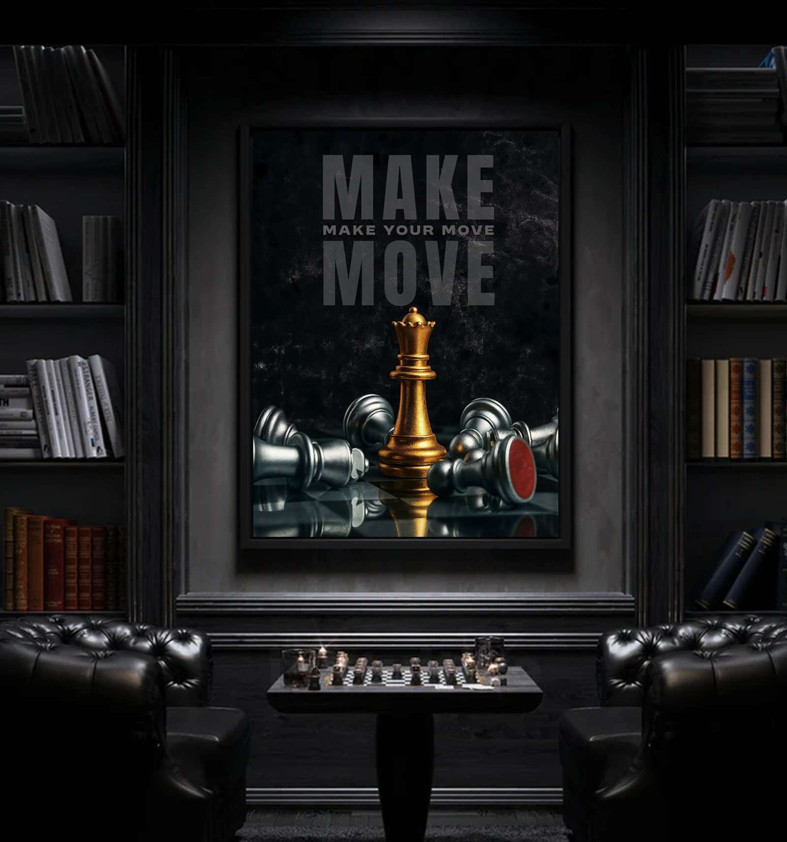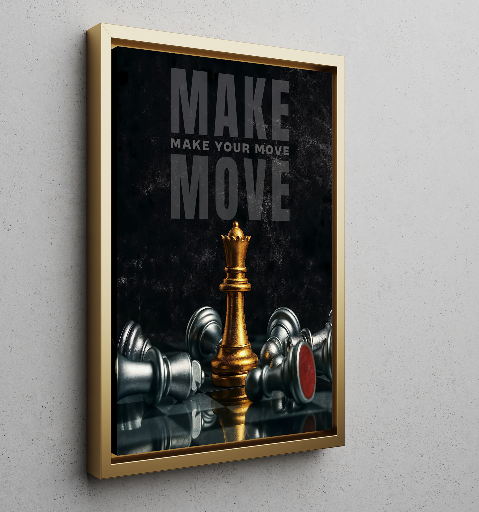 Bold, strategic, and intensely motivational, Make Your Move captures the essence of ambition and decisive action. Featuring a golden queen standing victorious among fallen silver pieces, this artwork symbolizes leadership, resilience, and the courage to rise when others fall. The strong typography reinforces the message: the next step is yours. The moment is now.