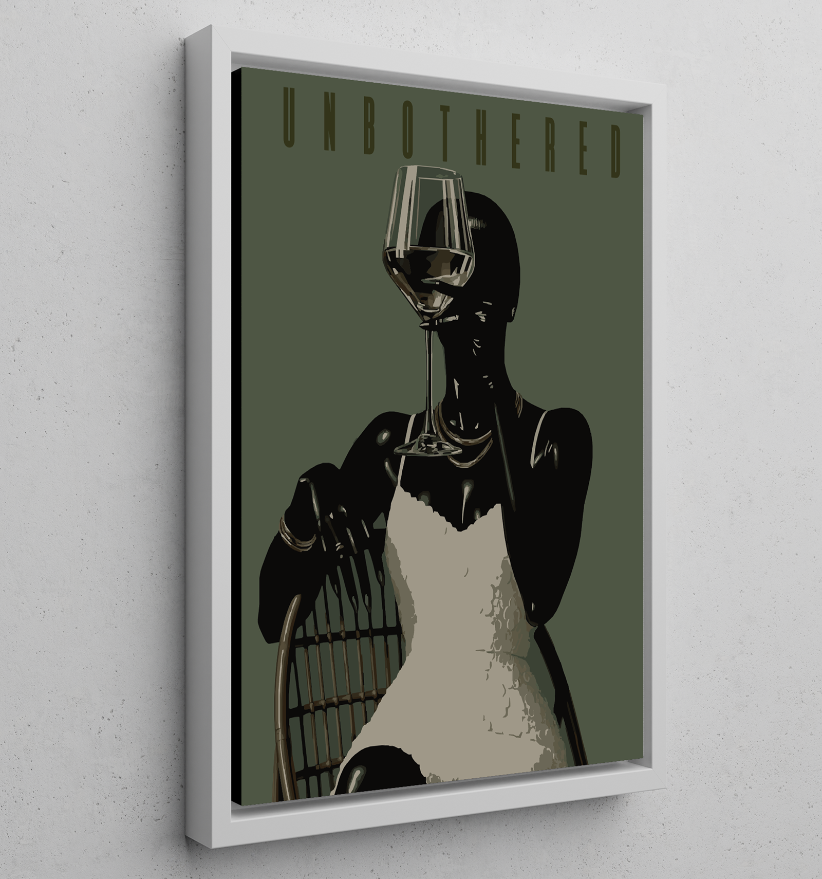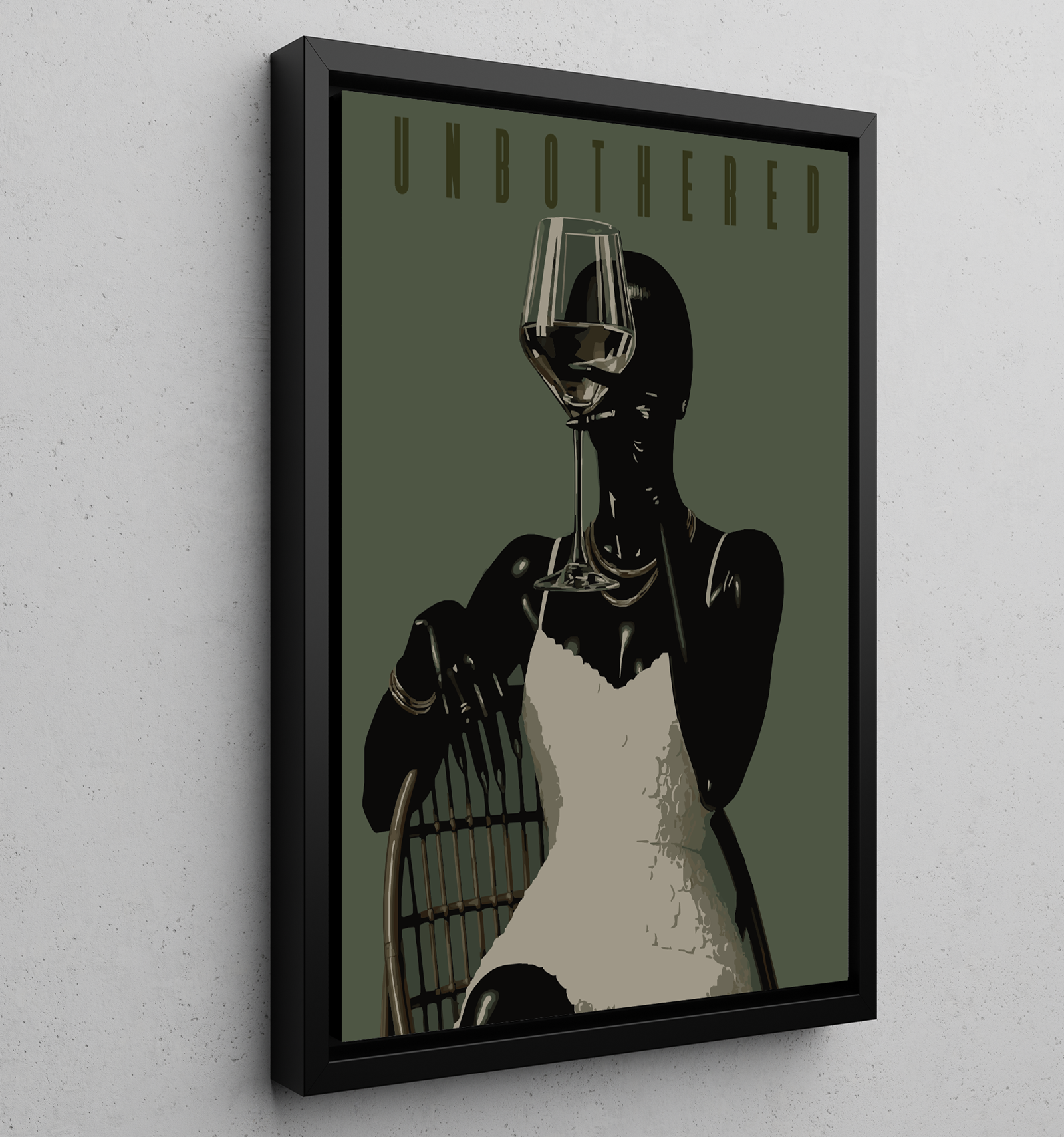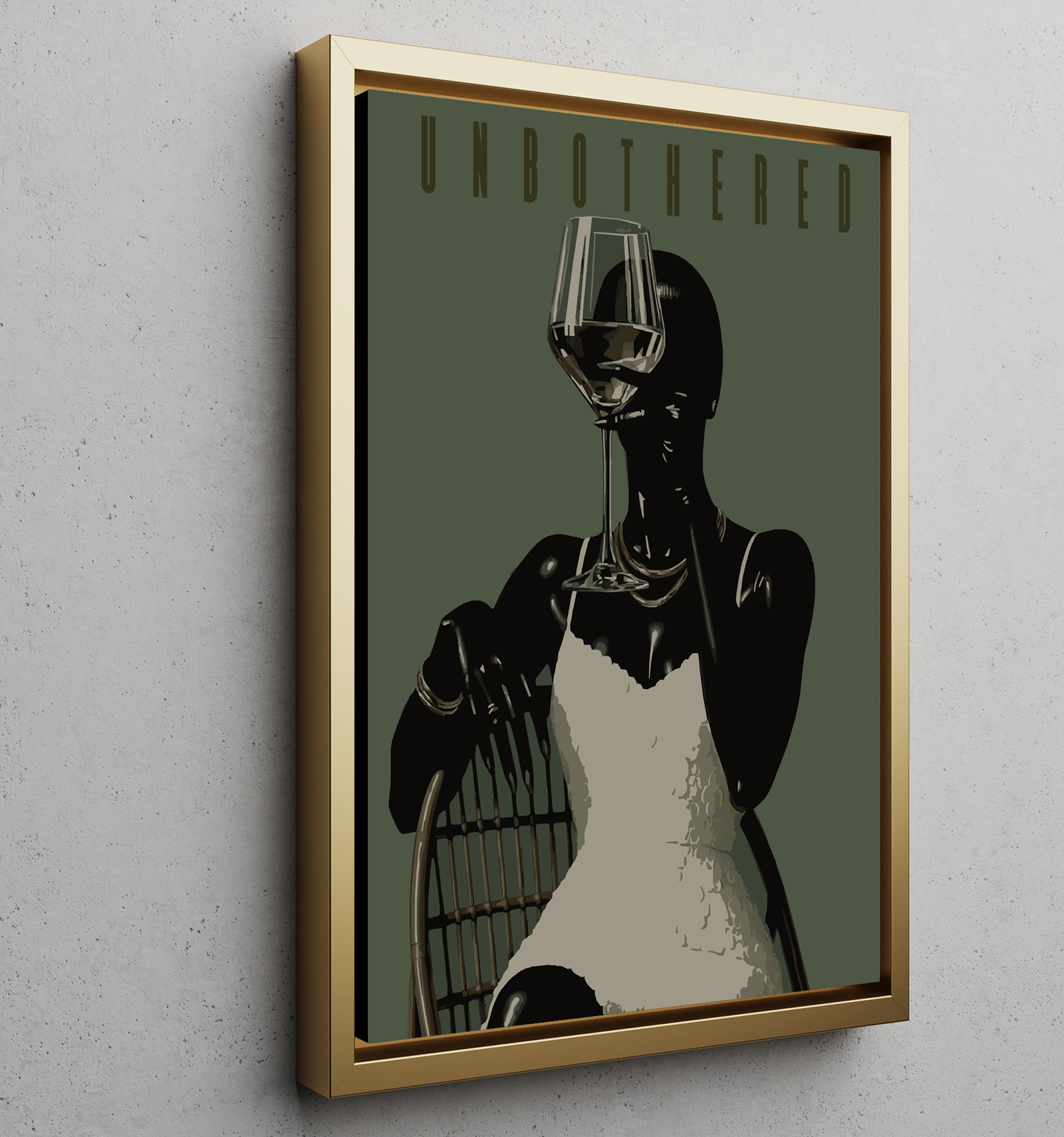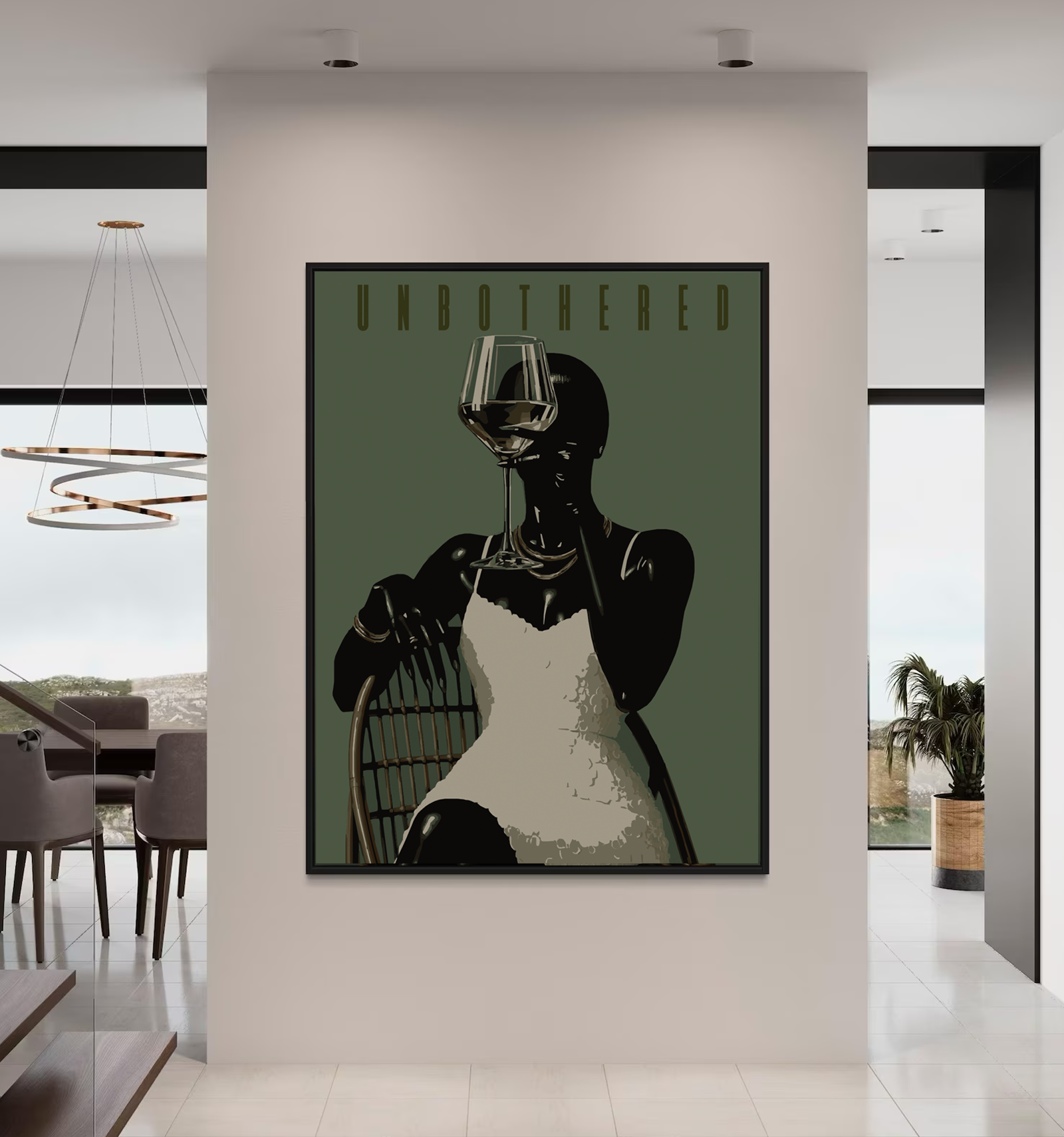 Bring quiet confidence into your space with UNBOTHERED, a bold canvas designed to express composure, emotional independence, and self mastery. The artwork features a poised Black woman seated calmly, her face partially obscured by a wine glass, symbolizing detachment from noise, opinions, and unnecessary explanations. Set against muted olive tones, the composition communicates luxury, restraint, and quiet dominance.