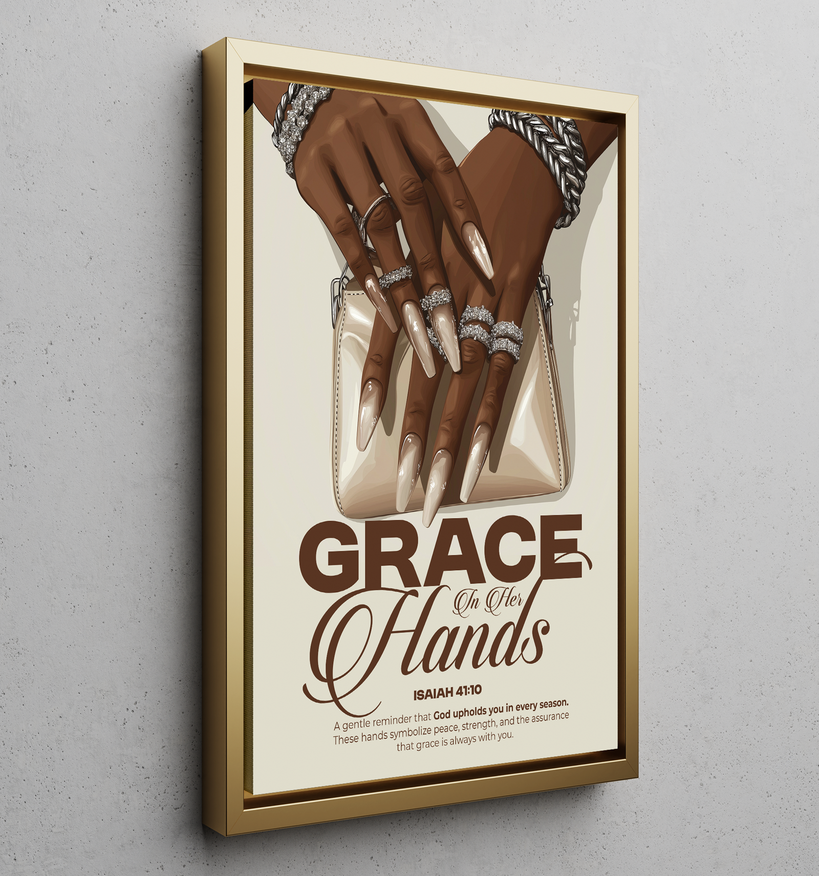 Elegant, powerful, and spiritually uplifting — Grace In Her Hands celebrates strength wrapped in beauty. Featuring a pair of poised, jewel-adorned hands resting gently over a soft-toned purse, this artwork symbolizes dignity, favor, and the quiet confidence that comes from knowing God is always near. It is a visual reminder of Isaiah 41:10 — that His grace upholds, strengthens, and surrounds you in every season.